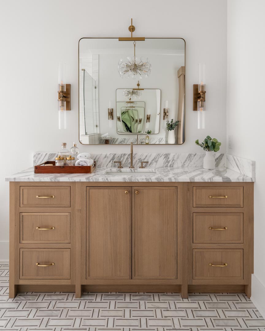Stone countertops with integrated backsplashes provide durability and elegance, and the precise fit around sinks, walls, and fixtures reflects the same attention to detail seen in the kitchen. Brass lighting and hardware echo the finishes used elsewhere, tying the spaces together visually.
