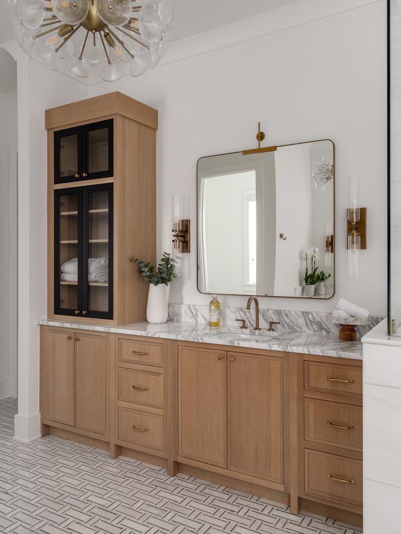 These spaces are a perfect example of how thoughtful design, quality materials, and precise execution come together to create a home that feels both elevated and inviting. Featuring cabinetry from Shiloh Cabinetry, this kitchen and bathroom showcase the natural beauty of white rift oak finished in a warm straw tone, paired with carefully selected stone surfaces and refined details throughout.