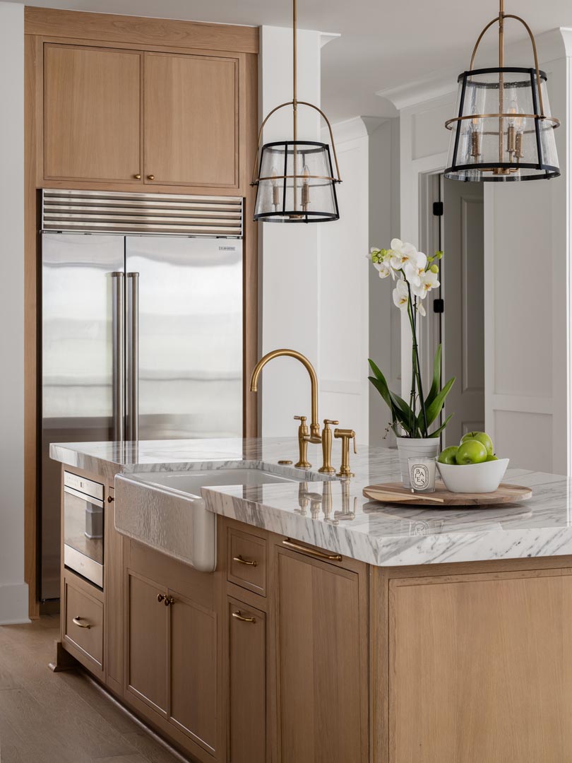Warm wood cabinetry pairs effortlessly with the cool elegance of the stone, while brass fixtures and hardware add contrast and a subtle touch of luxury. Glass front upper cabinets introduce visual depth and create opportunities to display everyday pieces in a curated, intentional way.